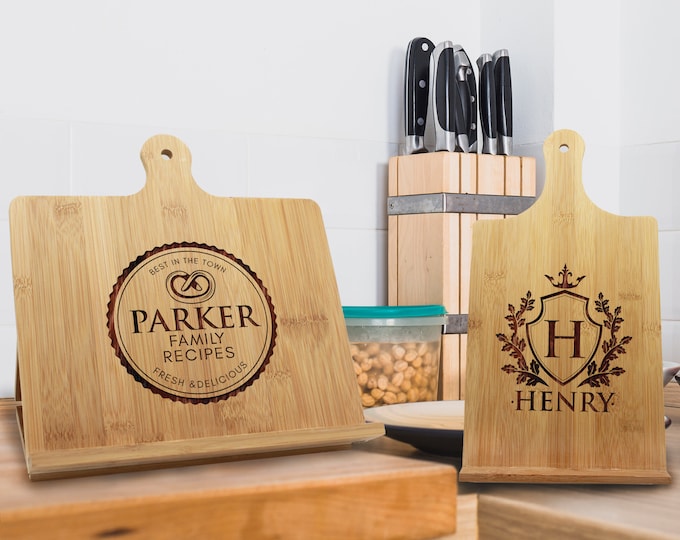 Personalized Cookbook Stand – Engraved Bamboo Recipe Stand – Wooden Recipe Book Holder