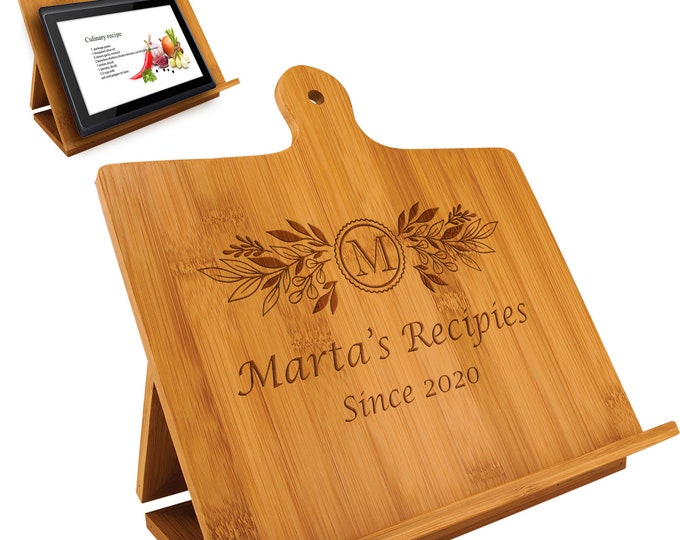 Personalized Bamboo Cookbook Stand – Custom Engraved Recipe Holder with Tablet & Book Easel, Wedding, Housewarming, Mom Gift