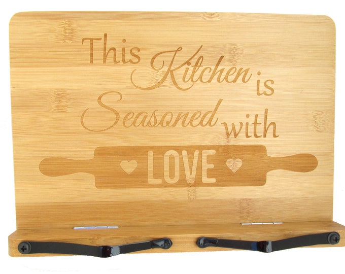 Seasoned with Love Cookbook Stand – Engraved Bamboo Recipe Stand – Wooden Recipe Book Holder